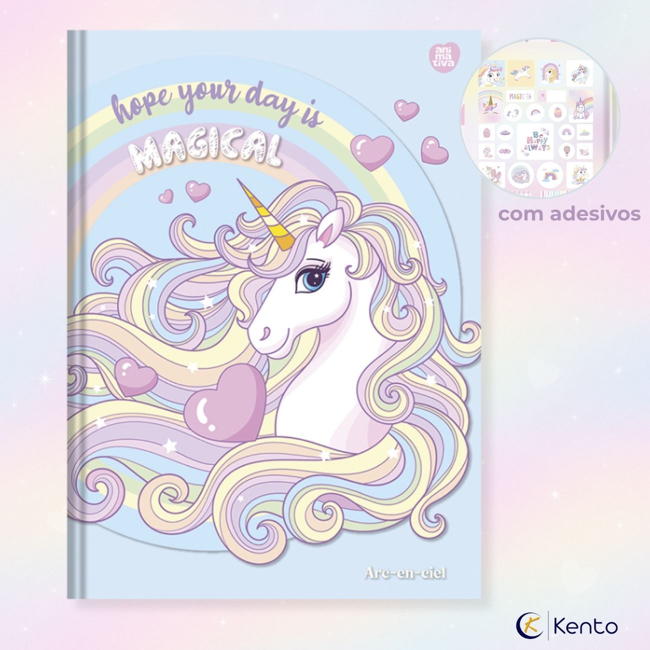 caderno unicórnio, caderno capa dura, caderno escolar 80 folhas, caderno arco-íris, caderno decorado, caderno brochura São Domingos, caderno Animativa, caderno adesivos, caderno unicorn pastel, caderno arco-en-ciel.