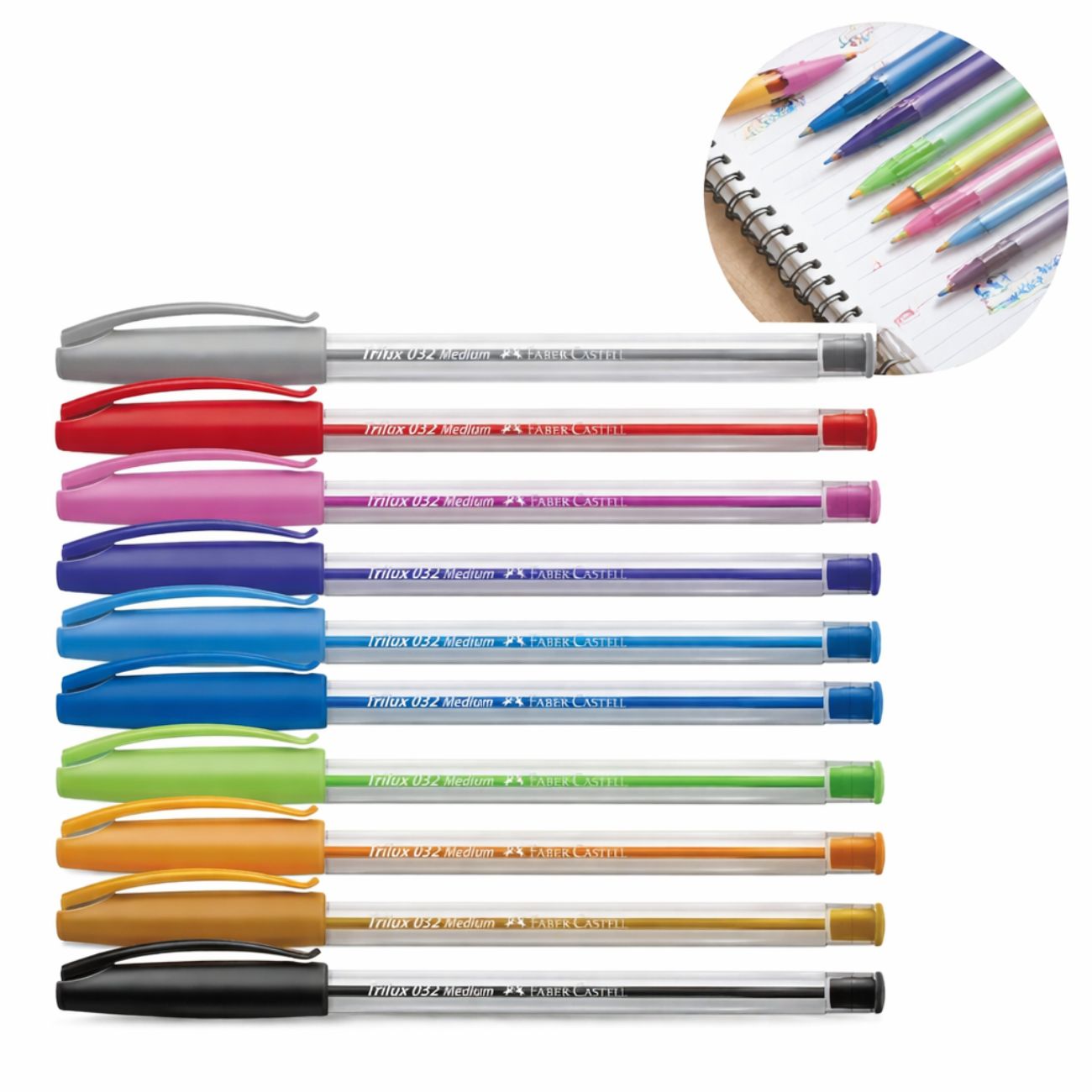O produto acompanha um estojo com 10 canetas esferográficas Trilux 032 em cores sortidas, incluindo cores tradicionais e especiais.